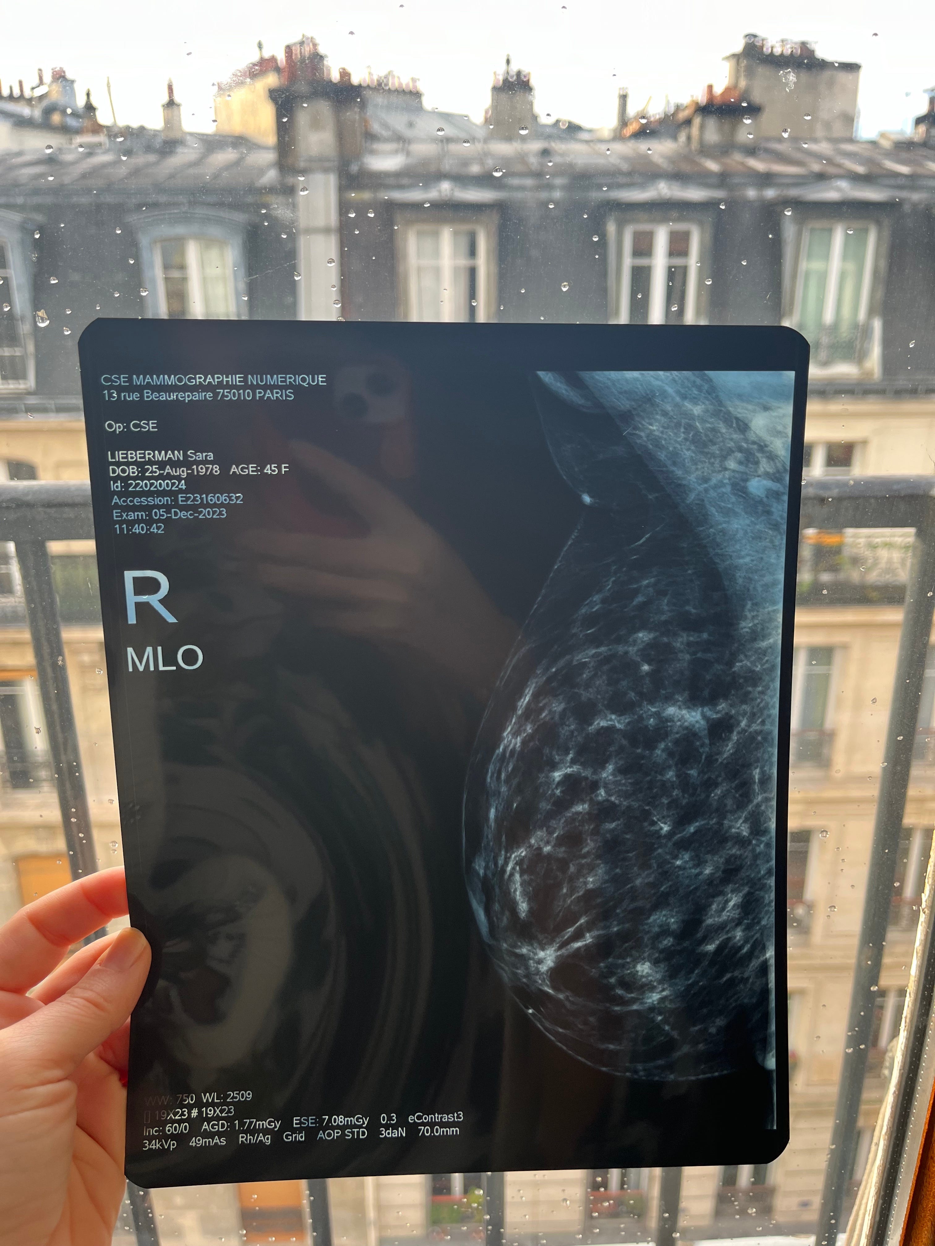 I shift on the Rice Krispies. He hands me a paper towel to wipe my breasts while speaking very fast. My face must’ve expressed confusion because he repeated himself in English: “Get dressed and pay in front.” I do and leave 30 minutes later with an 8x11 folder of black-and-white scans that resemble the solar system, a receipt for €139, and a typed-up evaluation in French. Do I keep it? Shove it into one of the boxes or bags heading across the Atlantic?