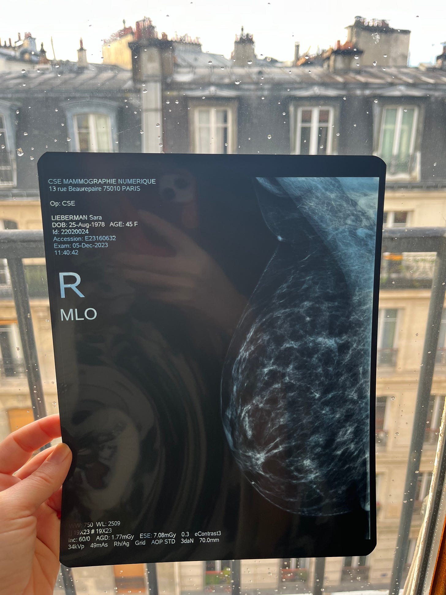I was confused, as usual. Because French. Because France. But I know that word: respire. And then: pas de respire. I looked at my left arm, held out like a T, as it lightly touched the machine while another part of it clamped down my mammary gland. There it is again, the word I’d had tattooed as a reminder just a month ago: respire. But wait, not now. Pas de respire, she said. But did she mean when the machine moved or just hovered? What happens if I breathe? Will I mess up the scan? Produce a false positive? Or is it a negative? What result am I aiming for?