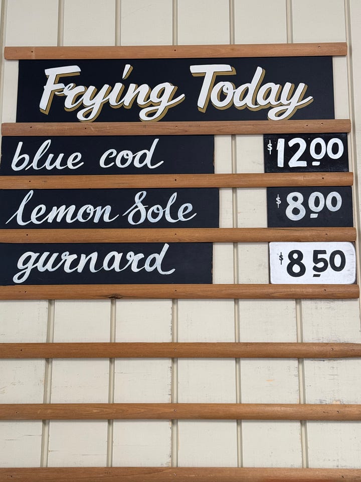 I placed my takeaway dinner order—a battered blue cod burger served on a brioche bun with tomato, lettuce, and tartar sauce, and a “half pocket” of chips—paid, gave my name, and then looked around for a seat to wait.