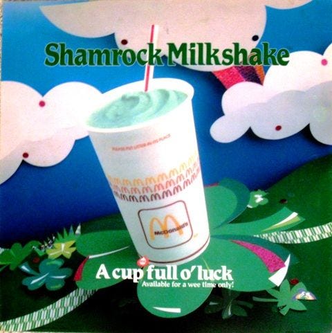 Today’s souvenir comes from my friend Shira who says this time of year always reminds her of Shamrock Shakes and McDonald’s Monopoly: “When circumstances aligned, sometimes [we’d get] that and a hash brown for breakfast on the way to school. It’s an experience in tandem with the Monopoly situation. We wanted the stickers and that was our purchase. We’d plaster the dashboard with our hotels and properties.” I have zero recollection of such shakes or stickers—we collected the character glasses and Happy Meal figures. What about you? Were/are you a fan?
